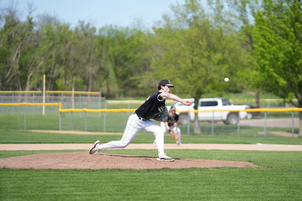 Hawks pitcher Reece Cox delivers a strike during his three-inning relief outing against the Ellsworth Hubbers on May 10. Cox struck out six and allowed just one earned run in his debut for Hastings. Photo by Bruce Karnick